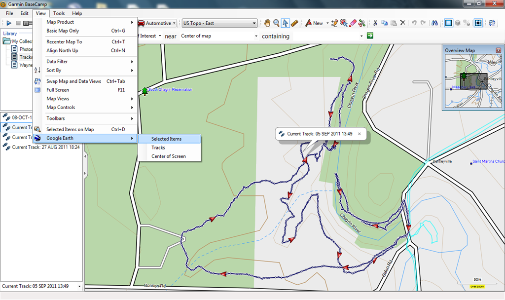 Select the data you wish to load into Google Maps then go to the View menu and select Google Earth. From the sub menu click Selected Items. See the image to the right for an example.- Google Earth will open and the selected data will be loaded into the Temporary Places folder in a sub folder named BaseCamp. This folder will contain all the data that you selected to be exported to Google Earth. Tracks can be found in the BaseCamp –> Tracks –> Paths folder. Select the tracks and any other items you wish to load into Google Maps the right-click on one of the