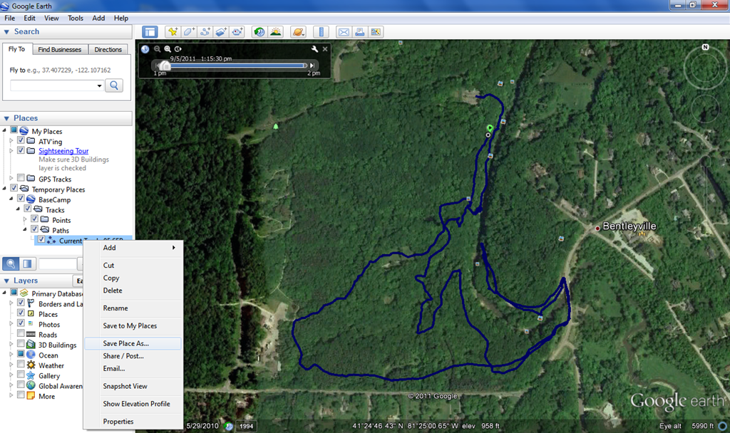 Google Maps allows you to create custom maps that include waypoints, paths, pictures, etc. Points can be entered manually or imported into Google Maps as .kml or .kmz files. The problem is that the Garmin software does not allow you to export data in these formats. Google Earth however, does. With BaseCamp’s ability to export data to Google Earth, we can use Google Earth as an intermediary to get GPS data into Google Maps.