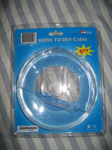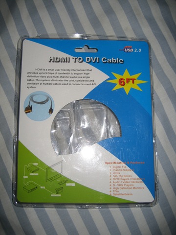 Having the fancy new 1080p LCD TV I now needed a DVI to HDMI cable so I could hook my computer up to it. I picked one up off NewEgg (great place to get these kind of things for cheap) and about 3 days later it arrived. I pulled it out of the package and it’s your standard DVI to HDMI cable as one would expect. It’s hooked up and it works great but, I noticed something strange on the packaging. Take a look in the pictures and tell me if you can spot what’s wrong.